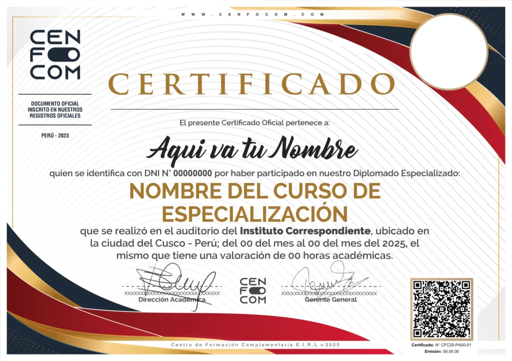El Centro de Formación Complementaria (CENFOCOM) emite un Certificado de Aprobación Académica, que acredita la participación y cumplimiento satisfactorio del plan de estudios establecido. Este reconocimiento valida el proceso formativo y garantiza que el participante ha alcanzado los objetivos académicos y técnicos definidos en el programa, en concordancia con los lineamientos institucionales y las buenas prácticas de capacitación profesional.